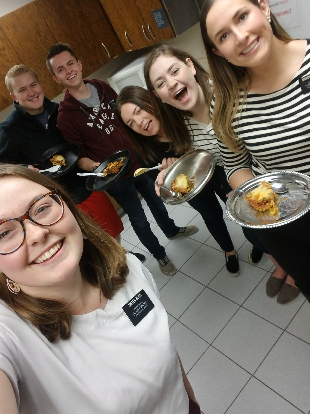 *Today we went to the church to eat lasagna with our district. But there were no plates and only two spoons, so we ate with trays, pan lids, and serving sporks!
